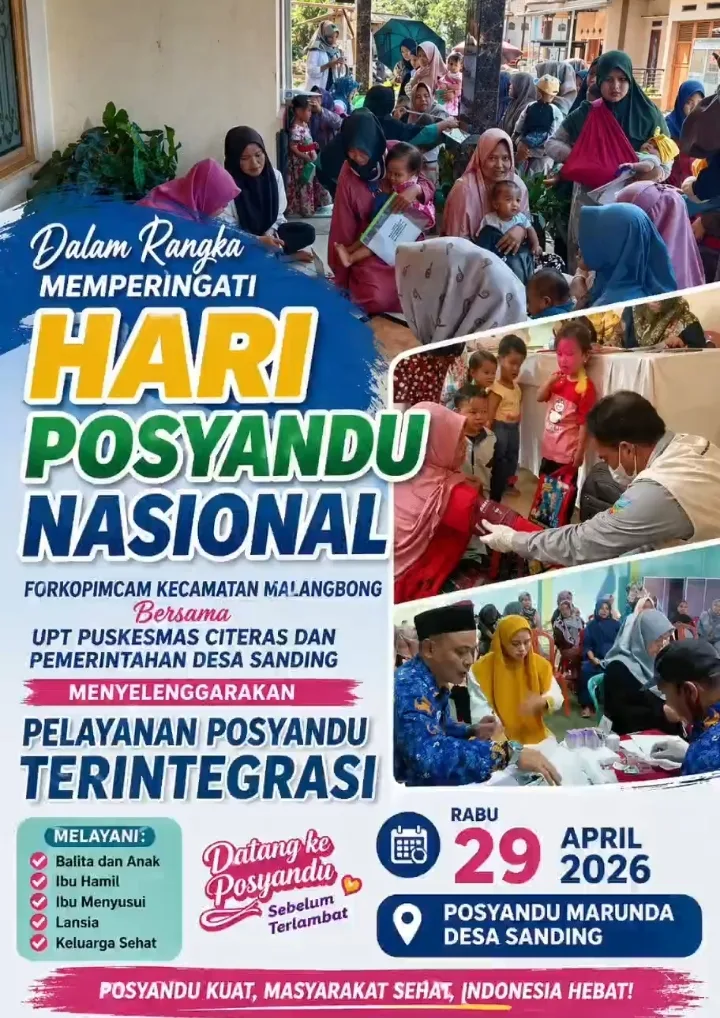 Garut –28 April 2026 Dalam rangka memperingati Hari Posyandu Nasional, Forum Koordinasi Pimpinan Kecamatan (Forkopimcam) Malangbong bersama UPT Puskesmas Citeras dan Pemerintah Desa Sanding menggelar kegiatan Pelayanan Posyandu Terintegrasi di Posyandu Marunda, Desa Sanding, Kecamatan Malangbong, pada Rabu (29/4/2026).