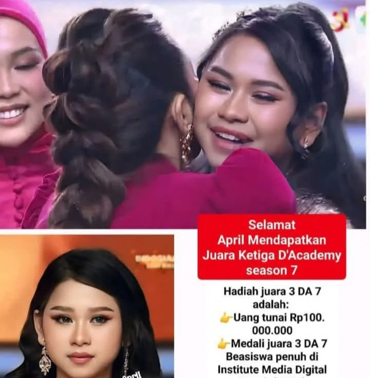 Keberhasilan April menembus posisi tiga besar tidak hanya memberinya popularitas, tetapi juga berbagai apresiasi bergengsi. Sebagai pemenang ketiga, April berhak membawa pulang paket hadiah fantastis yang mendukung masa depan karier dan pendidikannya.