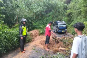 Garut | Polsek Banjarwangi Polres Garut bersama unsur pemerintah dan masyarakat melaksanakan penanganan bencana longsor yang menutup sebagian badan Jalan Raya Banjarwangi (Cijakang–Singajaya) pada Kamis, 04 Desember 2025 sekitar pukul 15.30 WIB.