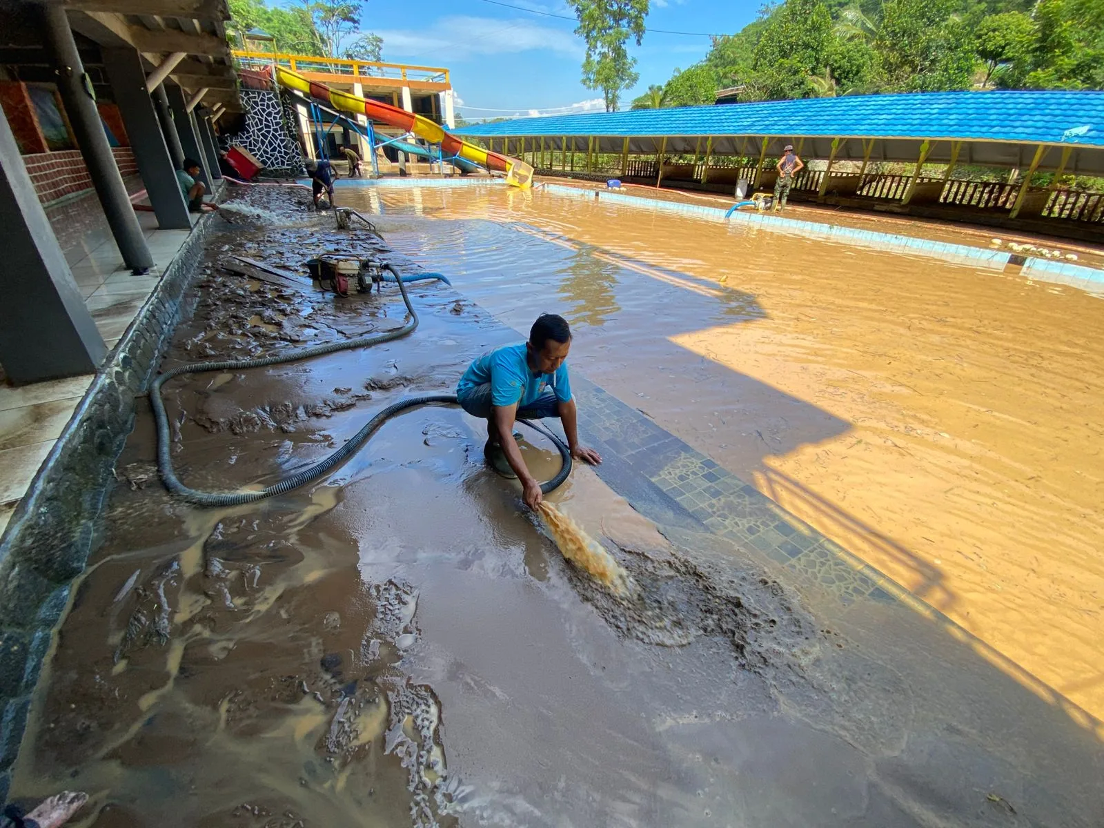 “Kejadian banjir kemarin sekitar pukul 15:00 WIB, air dari sungai naik ke atas masuk ke kolam renang dan kolam ikan. Memang dari hulu hujan deras terus di sana hutan sudah dibuka jadi lahan pertanian semua. Makanya selain air bawa juga lumpur dan pohon cabai,” sambungnya.