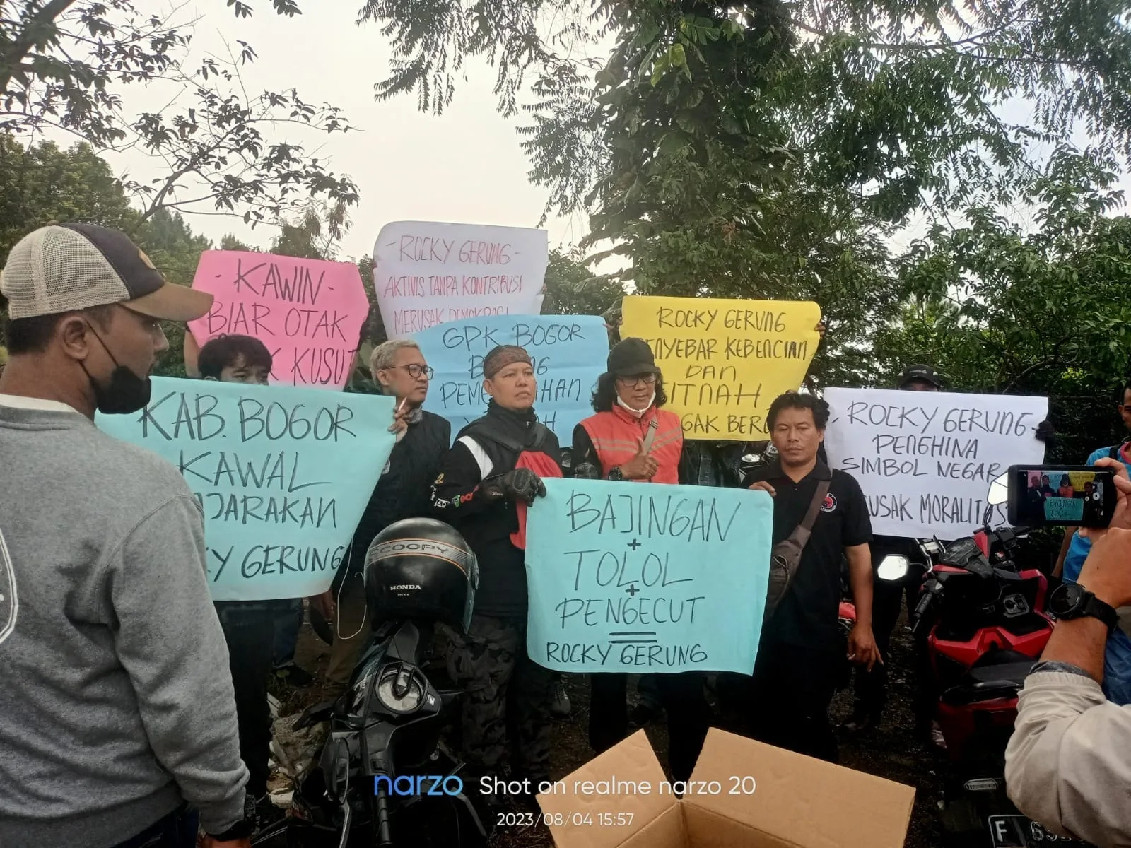 “Kami warga Kabupaten Bogor dan Komunitas Ojol Indonesia sore ini menyampaikan aspirasinya di depan rumah Rocky Gerung. Hal itu buntut penyebutan Presiden Joko Widodo sebagai ‘bajingan tolol’,” ujar Gunawan Olay sebagai Koordinator Aksi Ojol Indonesia dan Masyarakat Kabupaten Bogor pada Jumat, 4 Agustus 2023.