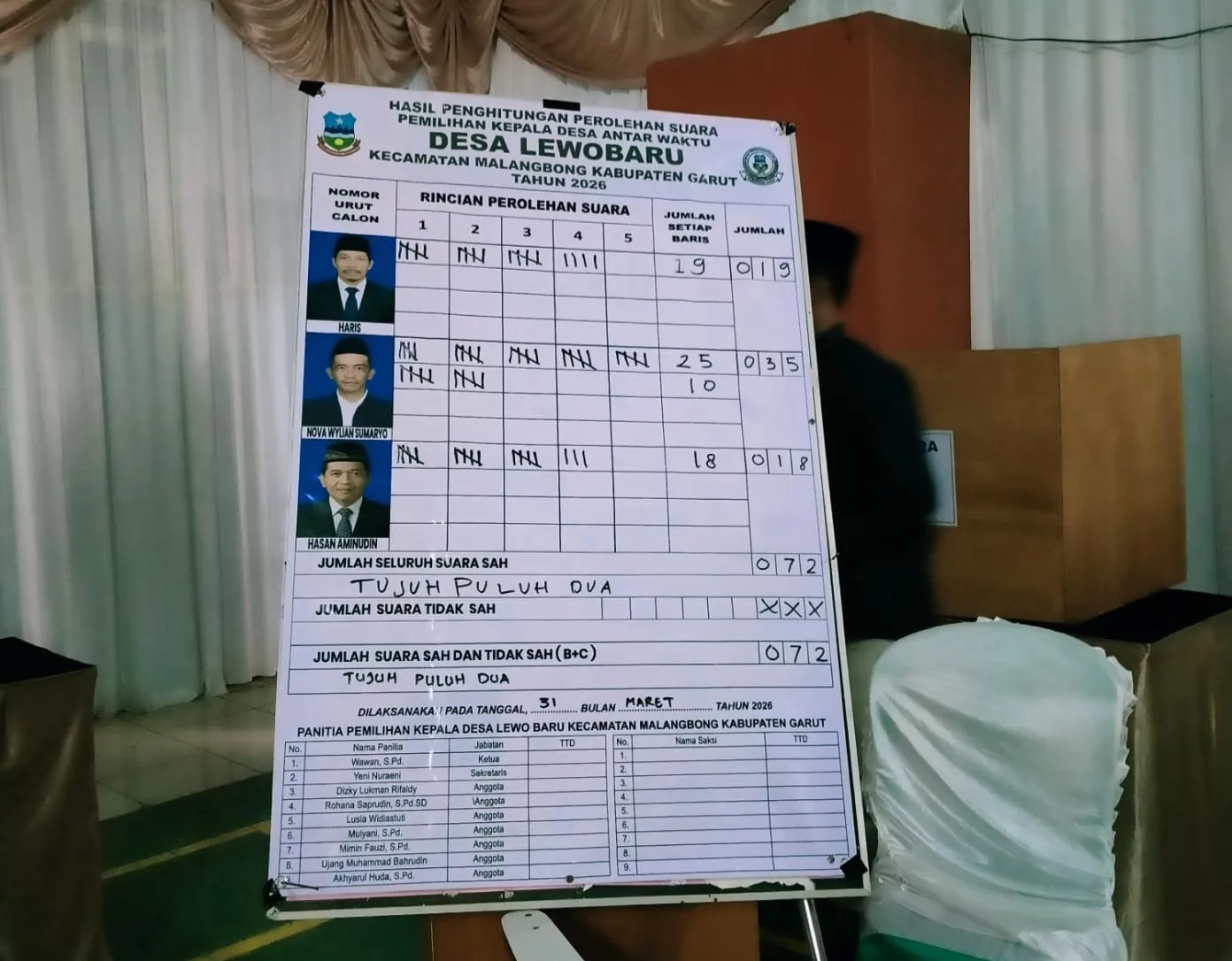 Ex-Pose.net, Garut – Calon nomor urut 2, Nova Wylian Sumaryo, berhasil memenangkan Pemilihan Antar Waktu (PAW) Kepala Desa Lewo Baru, Kecamatan Malangbong, Kabupaten Garut, setelah unggul dalam perolehan suara dari dua kandidat lainnya pada Selasa (31/3).