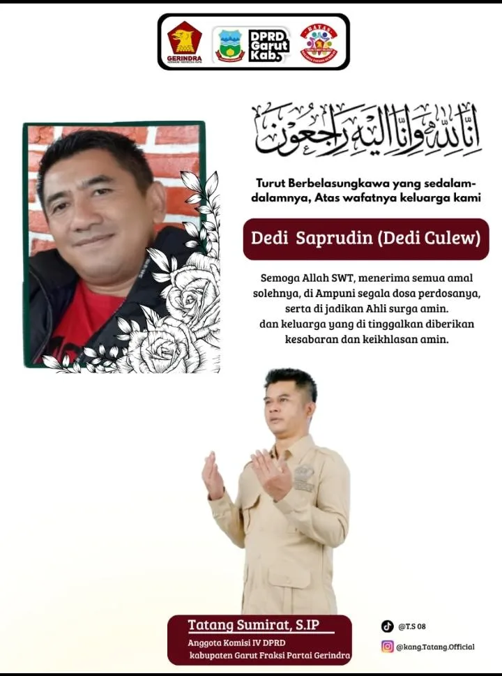 Anggota Komisi IV DPRD Kabupaten Garut dari Fraksi Partai Gerindra, Tatang Sumirat, S.IP, turut menyampaikan duka cita yang mendalam atas kepergian almarhum.
