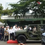Dalam mobil yang dikendarai langsung oleh Menhan Prabowo Subianto, Presiden Jokowi meninjau pameran Alat Utama Sistem Pertahanan (Alutsista) yang merupakan bagian dari rangkaian acara rapat pimpinan. Presiden Jokowi kemudian memecahkan kendi sebagai prosesi peresmian kendaraan tersebut dan menamainya “Maung“.(Puspen TNI).
